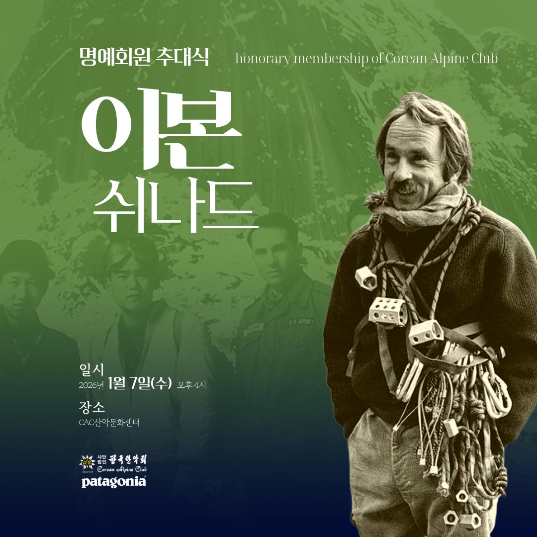 아래와 같이 행사를 진행하오니, 관심 있는 회원 여러분의 참석을 바랍니다.날짜: 2026년 1월 7일(수) 오후 4시-5시장소: CAC산악문화센터(우이동)주요 행사 일정